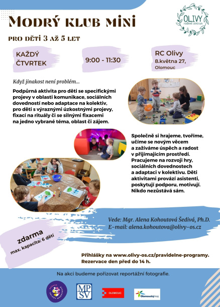 Podpůrná aktivita pro děti od 3 do 5 let se specifickými projevy v oblasti komunikace, sociálních dovedností nebo adaptace na kolektiv, pro děti s výraznými úzkostnými projevy, fixací na rituály či se silnými fixacemi na jedno vybrané téma, oblast či zájem.