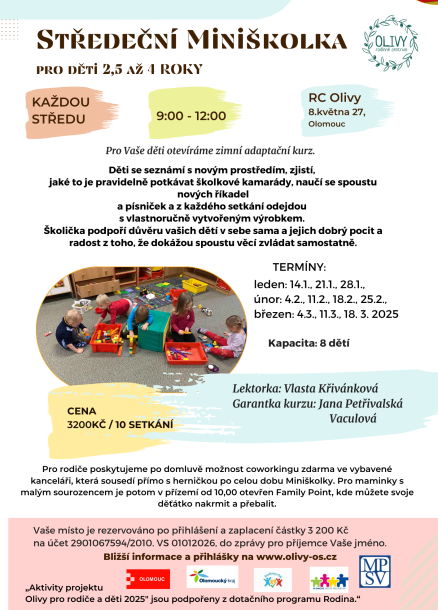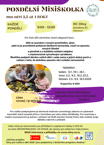Hledáte klidné a dobře vybavené zázemí pro Vaši práci a současně i možnost pohlídání Vašeho dítka v oddělené místnosti, ale Vám nablízku? Nabízíme Vám vše v jednom příjemném balíčku. RC Olivy disponuje prostornou kanceláří s možností připojení k internetu, současně prostornou, bezpečnou a vybavenou hernou, kde si Vaše dítě může bezpečně hrát v péči našich hlídacích tet. Můžete využít kancelář i hlídání současně, ale nabízíme i jedno či druhé separátně, přesně dle Vašich potřeb.
